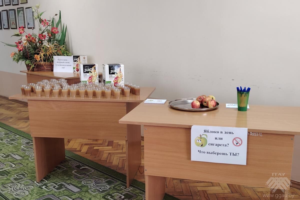 На интерактивной площадке «В будущее – без табака!» специалисты Гродненского областного ЦГЭОЗ предложили студентам полезную альтернативу курению в виде яблок - обменный пункт «Никотин на Витамин», а также рекомендовали заменить сигарету стаканом свежевыжатого яблочного сока - дегустация «Яблочный рай - здоровья край!».