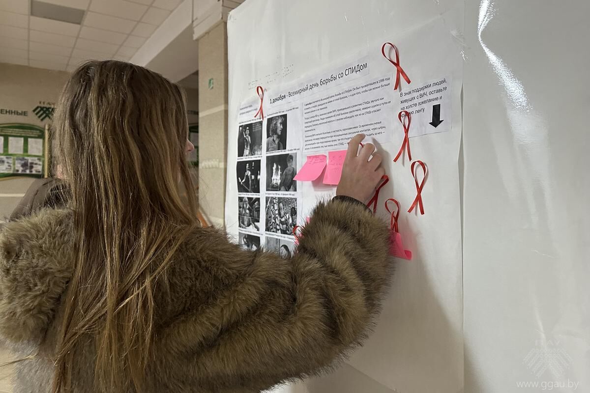Рядом с холстом каждый студент и сотрудник университета мог взять алую ленточку – международный символ осознания и поддержки в борьбе со СПИДом. Ленточку можно было прикрепить к холсту, оставив рядом письменное пожелание сил, здоровья и терпения людям, живущим с ВИЧ.