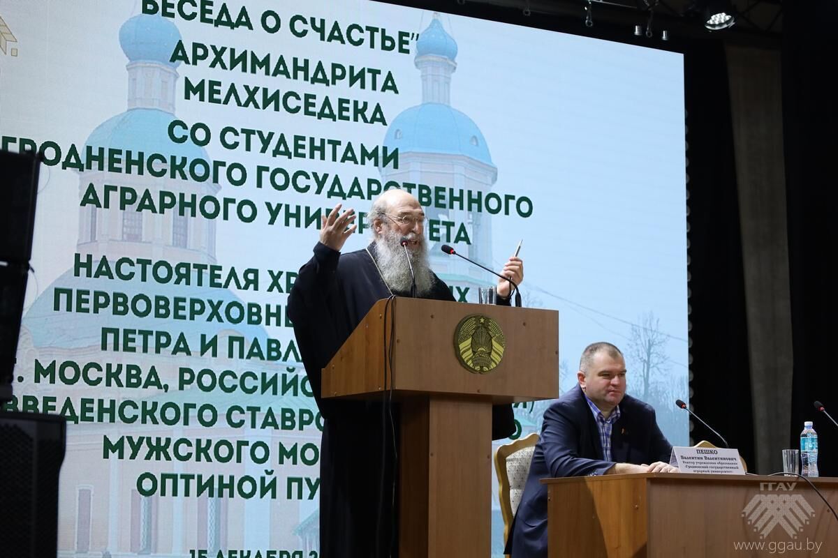 15 декабря в актовом зале Гродненского государственного аграрного университета состоялась встреча настоятеля подворья Оптиной пустыни в г. Москва архимандрита Мелхиседека (Артюхина) со студентами и преподавателями на тему «Беседа о счастье».