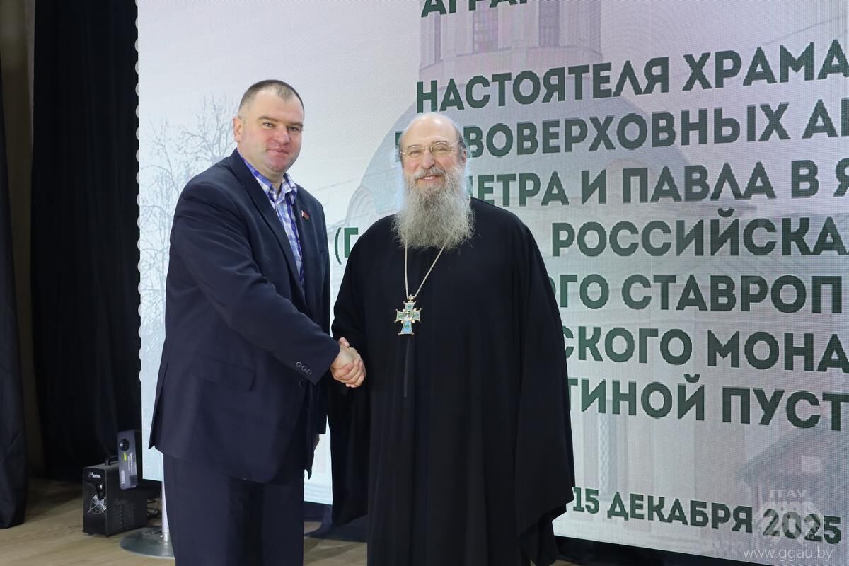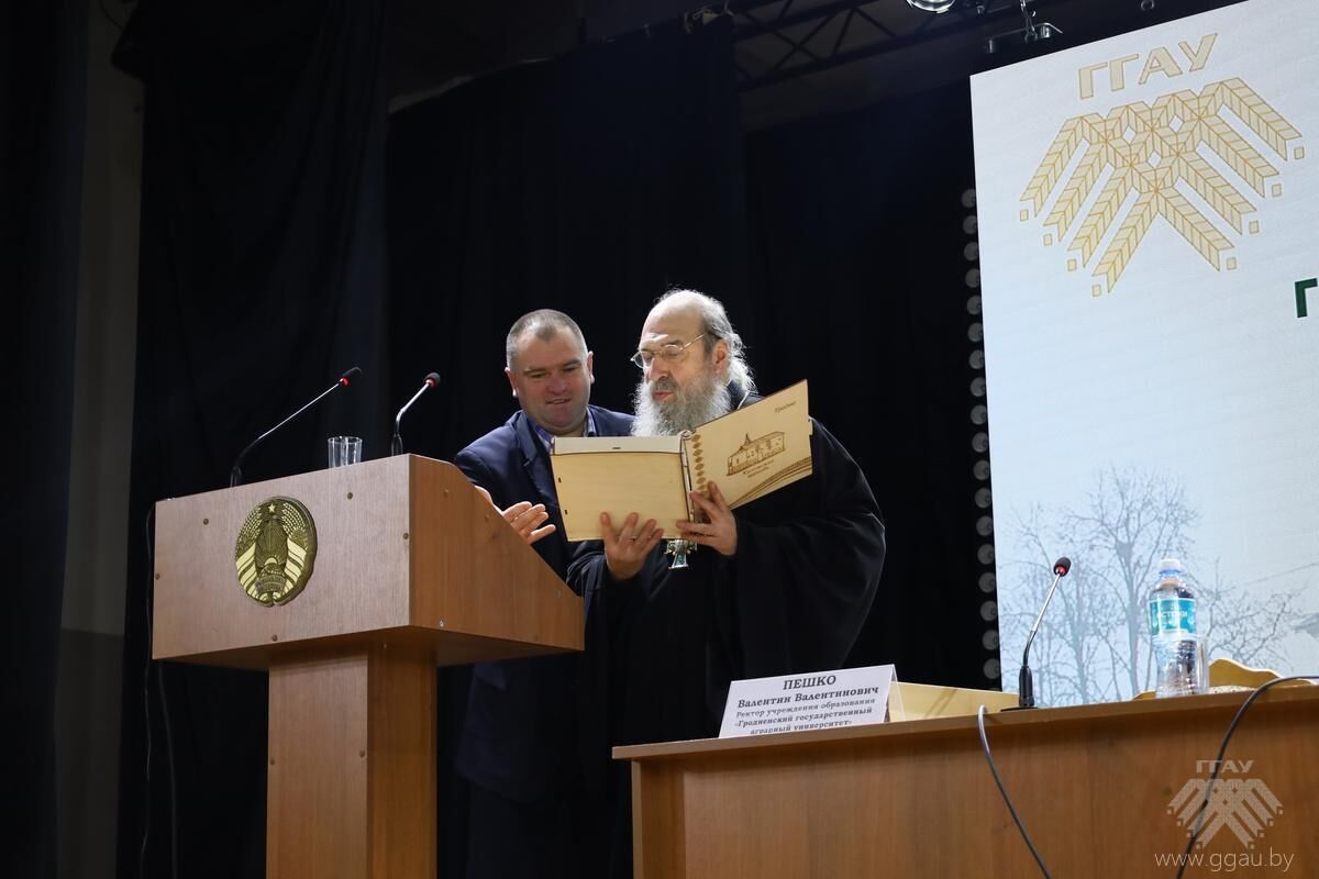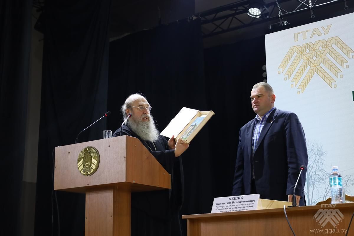 В конце встречи ректор университета Пешко Валентин Валентинович поблагодарил архимандрита Мелхиседека (Артюхина) за содержательную и глубокую беседу и вручил на память о визите в УО «ГГАУ» фотоальбом «Коложская церковь» на белорусском, русском и английском языках (автор текста и составитель Александр Лосминский).