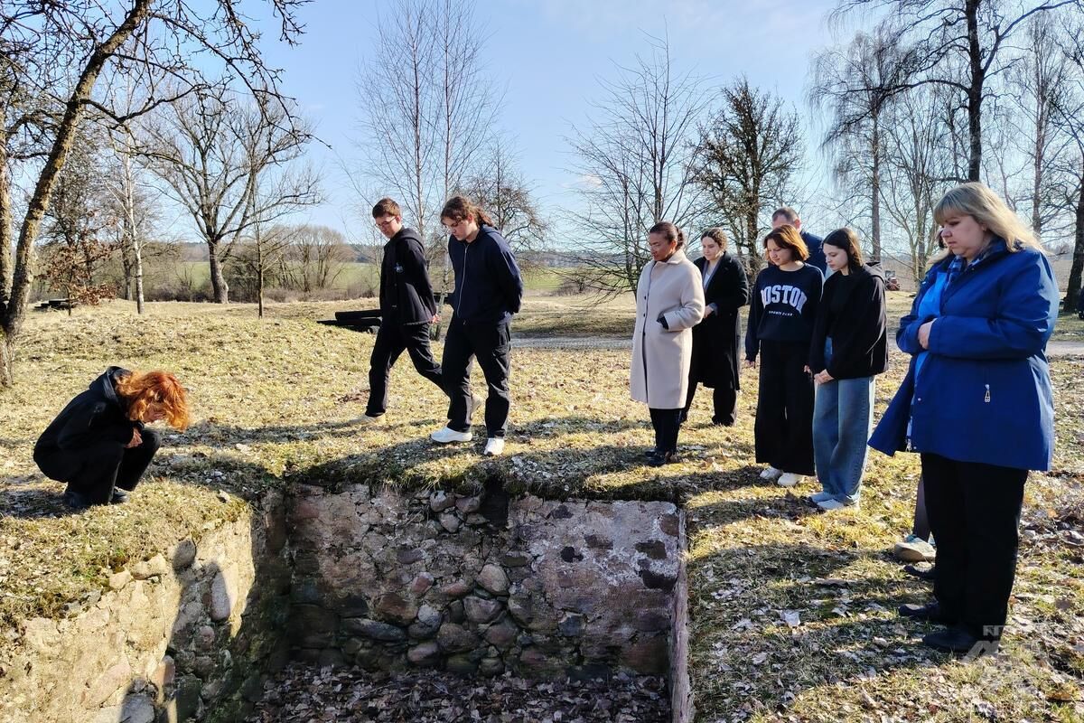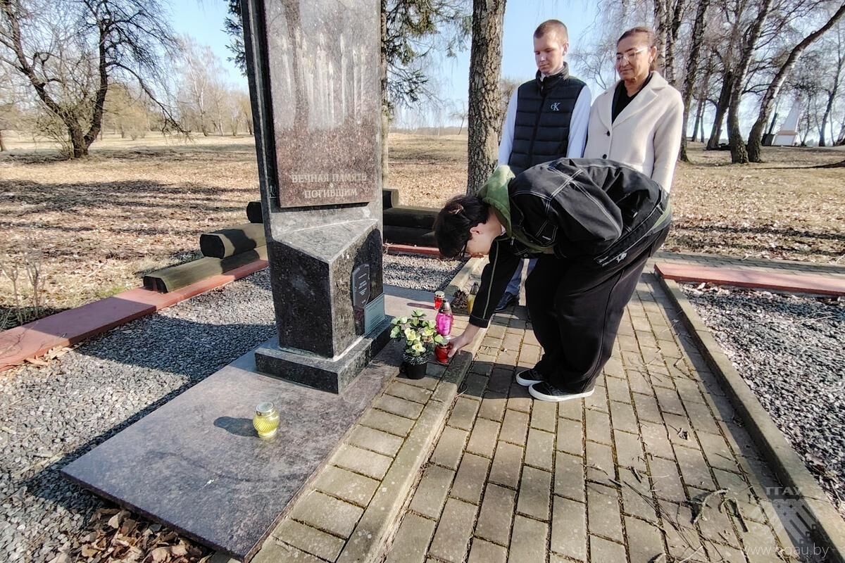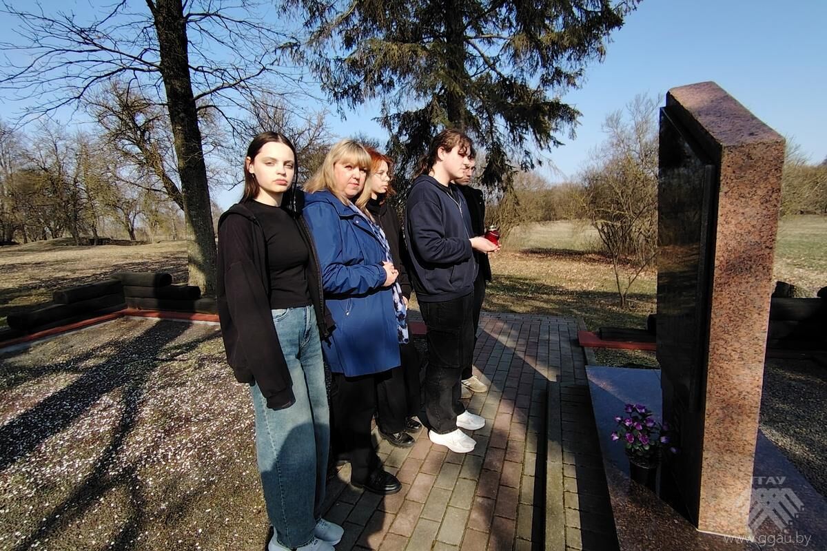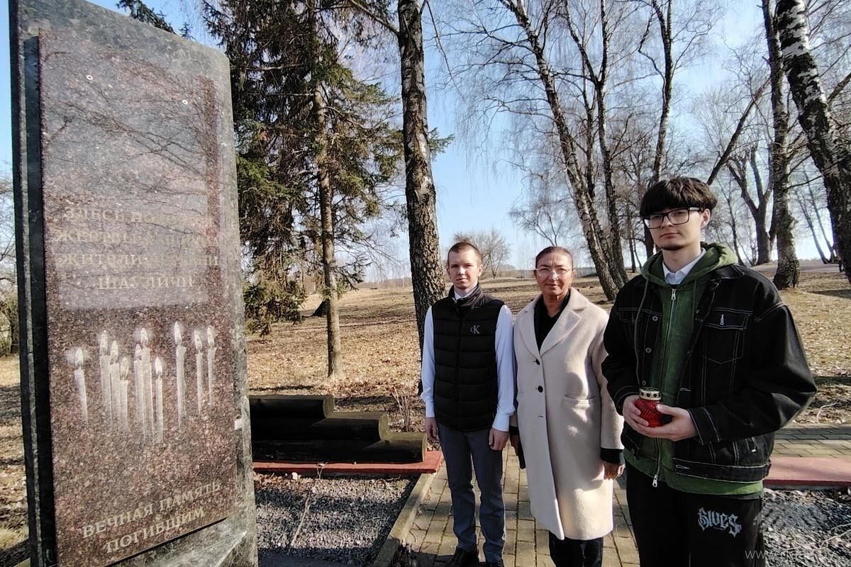 Студенты и преподаватели осмотрели местные памятники и мемориалы, черные деревянные срубы-символы на месте сгоревших домов напоминающие о тех далеких событиях. Позвонили в колокол памяти, зажгли и возложили лампадки и почтили память погибших минутой молчания.
