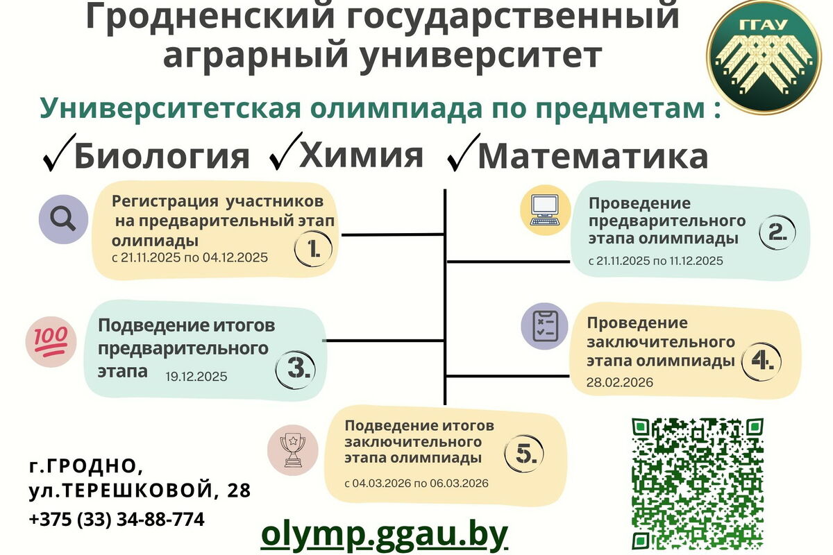 Приглашаем 11-класников принять участие в университетской олимпиаде по 3 учебным предметам (биология, химия, математика), победители которой (дипломы I, II, III степени) имеют право зачисления без вступительных испытаний в учреждение образования «Гродненский государственный аграрный университет» в 2026 году.